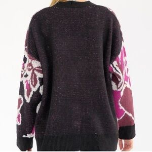 Stay cozy and stylish with this floral patterned button-up sweater. Featuring a blend of pink and black hues, this sweater is perfect for any casual outing.