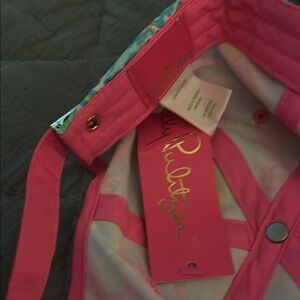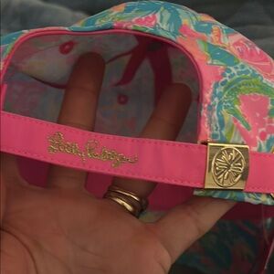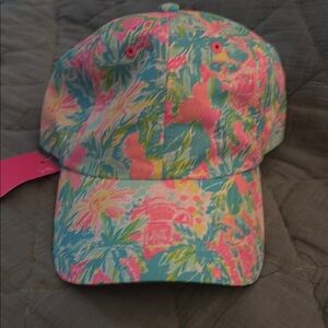 Vibrant floral patterned cap with pink, blue, and yellow hues. Perfect for a sunny day.