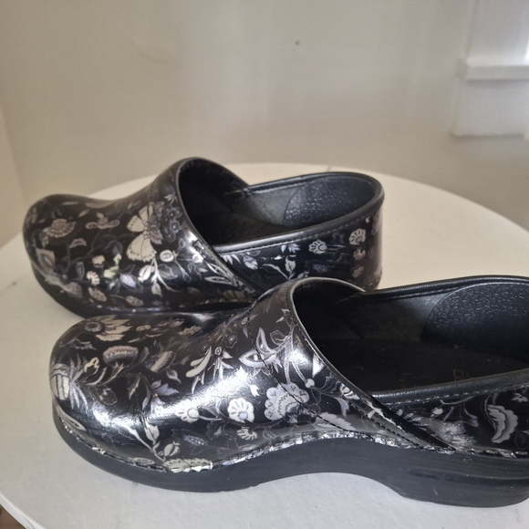 Stylish clogs with a floral pattern. Features a black and silver color scheme.