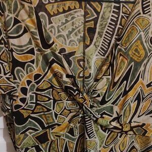 This stylish dress features a vibrant floral pattern in shades of green, yellow, and black. Perfect for any occasion, it offers a comfortable fit and eye-catching design. measures 21 inches at the armpit and 40 inches long, midi length.