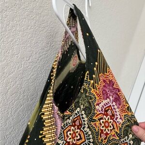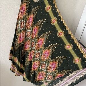 This elegant skirt features a vibrant floral pattern, perfect for adding a touch of color to your wardrobe. The green and pink hues create a stunning contrast, making it a standout piece for any occasion. Slight fraying on the bottom as shown in pictures.