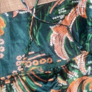 Stylish dress featuring a vibrant floral pattern. Includes a ruffle hem and adjustable straps. Perfect for a chic look.