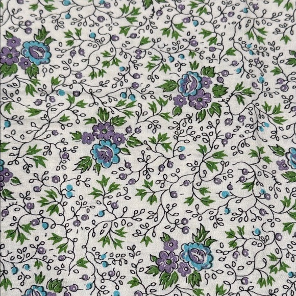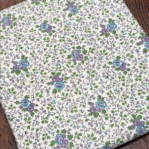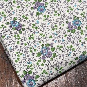 Beautiful fabric with a floral pattern. Features purple, green, and blue flowers on a white background. 35” x 59”, cotton or cotton blend.