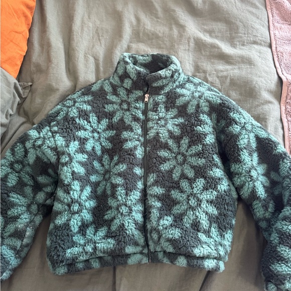 Cozy fleece jacket with a floral pattern. Features a zip-up front and high collar. Perfect for chilly days.