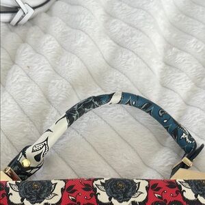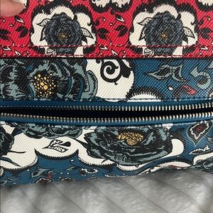 Stylish handbag featuring a vibrant floral pattern. The red and blue colors make it a standout accessory for any outfit.