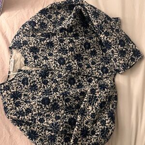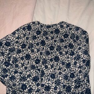 Elegant jacket with a floral pattern. Features a mix of blue and cream colors.