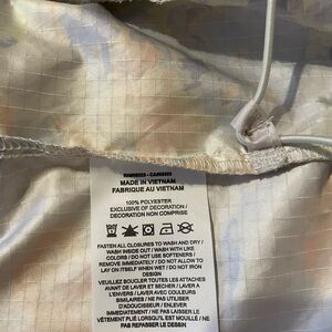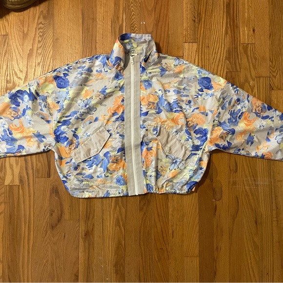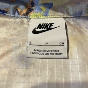 Vibrant Nike jacket with floral design. Features blue, yellow, and cream hues.