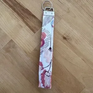 Stylish keychain with a floral pattern. Features pink and cream colors. Perfect for adding a touch of elegance to your keys.