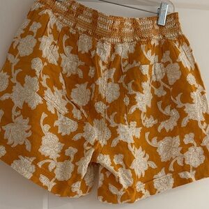 Chic linen-blend orange shorts with white floral design. Pull on styling with side and back pockets. Ideal for casual resort wear. Never worn.