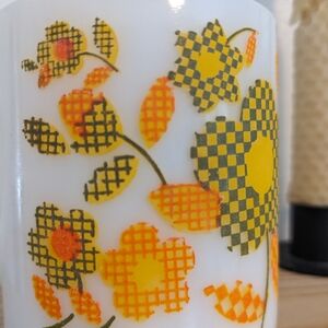 Cute, vintage white mug with orange and green checkered daisies. Still in great condition!