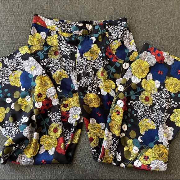 Vibrant floral patterned pants with a mix of colors. Perfect for a bold look.