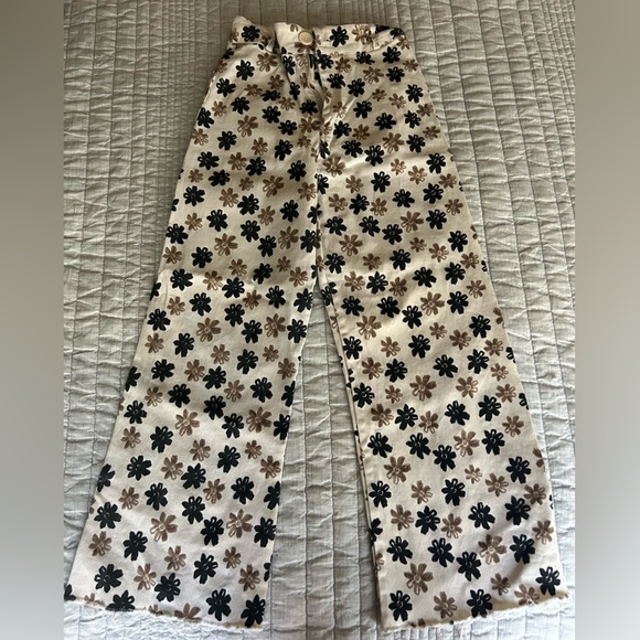 Stylish pants with a floral pattern. Features black and brown flowers on a cream background.