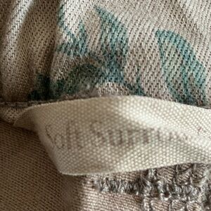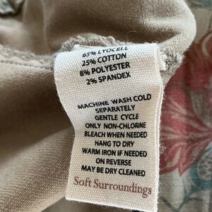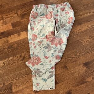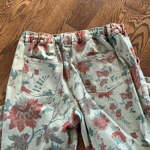 Elastic waist pull on pants with a vibrant floral pattern. Features shades of rust and green on a pale green background.