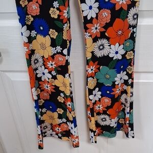 Vibrant floral patterned pants with a mix of colors. Perfect for a bold look.