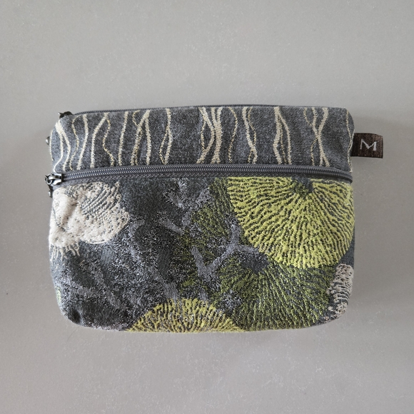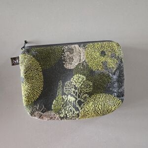 Stylish pouch with floral patterns. Features gray and green colors. Great for makeup, toiletries, and travel.