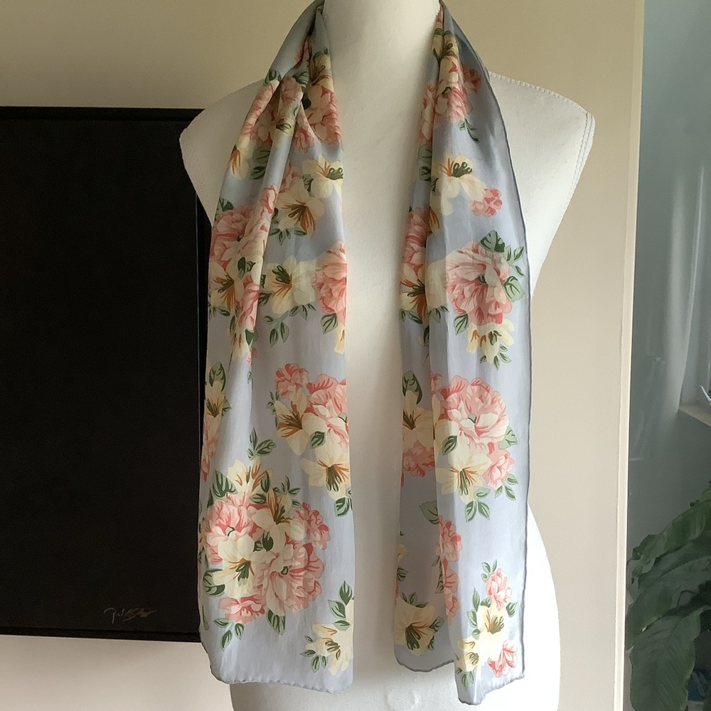 Pretty rectangular scarf with an old fashioned floral pattern. Features pink and cream flowers on a light blue background. No maker or fabric tags. Note stain on one edge in last photo. Priced accordingly.