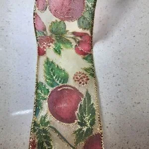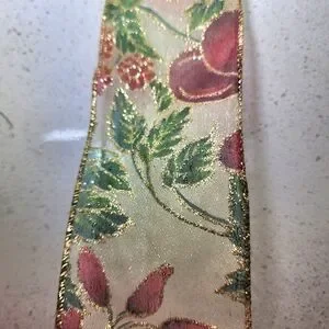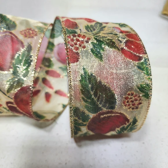 Holiday wired floral patterned ribbon featuring rich red, green, gold hues and glitter, perfect for wreaths, tree topper, wrapping gifts or for any craft project. Measuring approximately 25 to 30 yards and 2.5 inches wide. #vintage #Floral #decor #home #gift #luxurious #wired #ribbons #metallic #gold #glitter #tree #Christmas #green #red #wreaths #wired #ribbons #topper #crafts #holiday