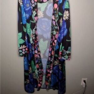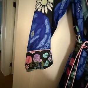 Karen Mabom, Elegant robe with a vibrant floral pattern. Features a tie belt for a perfect fit. Ideal for lounging in style. Selling matching silk pjs in another listing on my site!97% Mulberry Silk, 3% Elastane