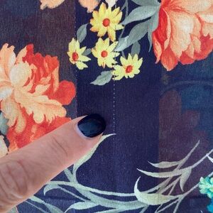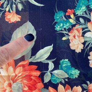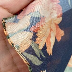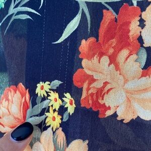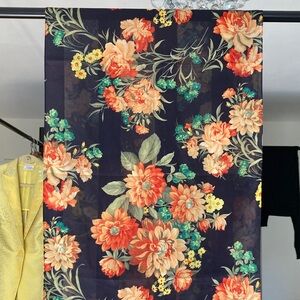 Scarf made out of vibrant floral patterned fabric with orange, green, and yellow flowers on a black stripy background. 14.5 inches wide and 59 inches long. Machine processed hem, fabric feels silky and delicate but there is no tag on the item. There some pulled threads that I will try to show on the photos.