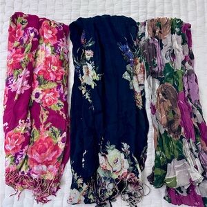 Set of three floral patterned scarves. Features vibrant colors and intricate designs. Perfect for adding a pop of color to any outfit.