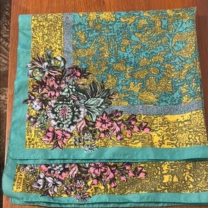 Elegant silk touch (not sure of the fabric) scarf with a vibrant floral pattern. Features shades of teal, yellow, and pink.