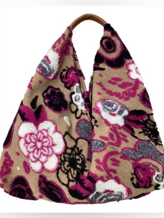 A beautifully textured tote that blends soft boho charm with a bold floral statement. The exterior features a plush, tapestry‑style fabric with painterly blooms in pink, white and black set against a warm beige base. The leather handle adds an earthy, sculptural touch that makes the whole piece feel elevated and one‑of‑a‑kind. This bag is perfect for spring markets, weekend outings, or adding a pop of personality to a simple outfit. Lightweight, eye‑catching, and effortlessly chic. Pairs beautifully with denim, linen, sundresses, and neutral basics. A perfect accessory for anyone who loves boho and cottagecore pieces.