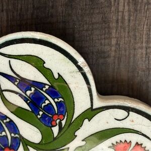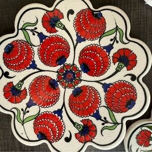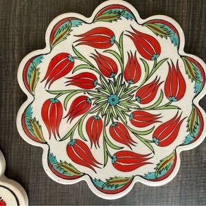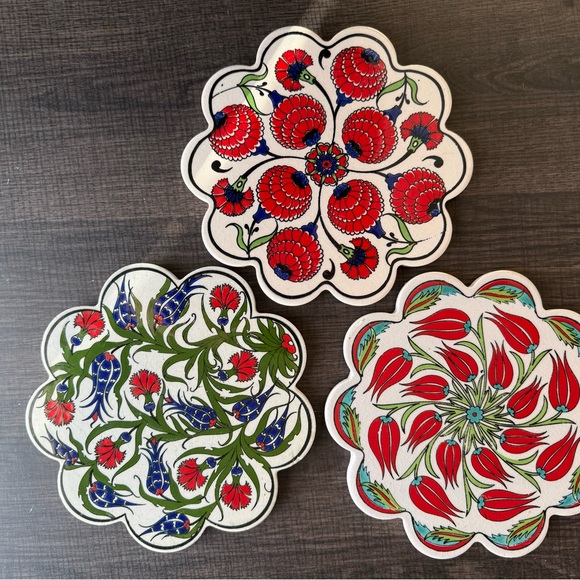 Set of three floral patterned ceramic trivets. Features vibrant red, green, and blue designs on a cream background. Perfect for adding a touch of color to your table. One has a small chip shown in photo and each has a padded backing. Made in Turkey