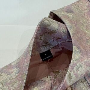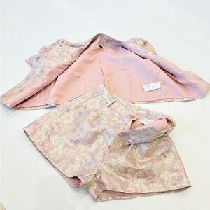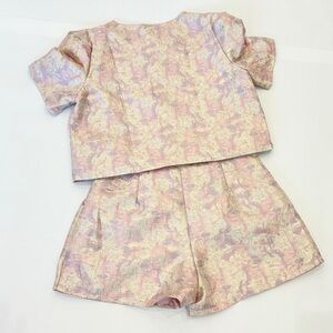 Chic two-piece set with a floral pattern. Features a short-sleeve top and matching shorts. Elegant button details.