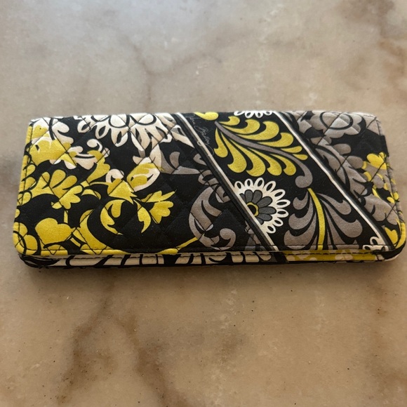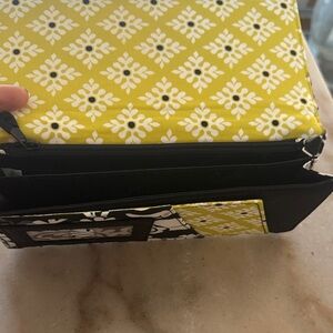 Stylish wallet with a vibrant floral pattern. Features black, yellow, and gray colors. Magnetic closure , 3 pockets inside , one with zipper. Slim style lots of room for money ,checkbook ,credit cards and change.