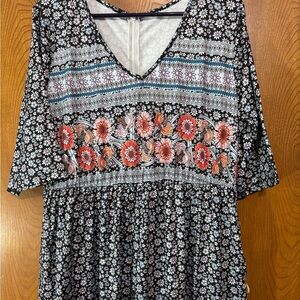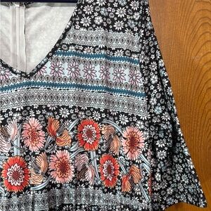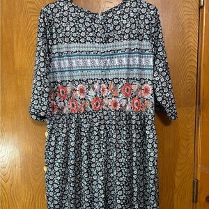 Color is black with white, blue and pink small flowers and same colors in larger print of flowers in border.