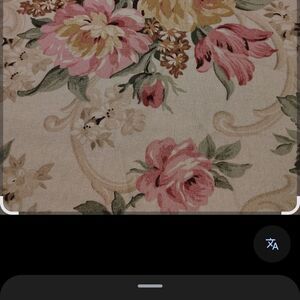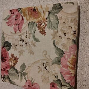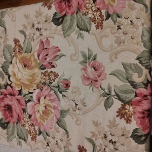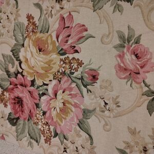 Beautiful floral fabric with pink, yellow, and green hues on tea stained background. Perfect for crafting or decor.