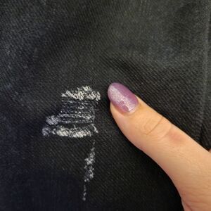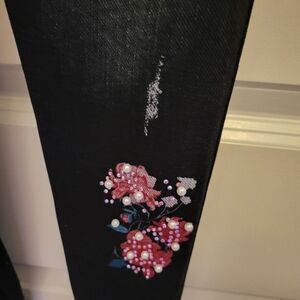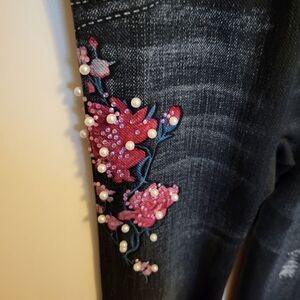 Jeggings/ Leggings made out of a stretchy material but made to look like distressed Denim. It has a pattern at the top to look like pockets and it has floral details embellished with cute pearls.