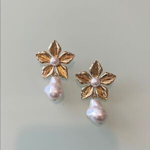 Elegant gold floral earrings with silver pearl accents. Perfect for adding a touch of sophistication to any outfit.