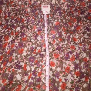 Button-down front with brown/pewter buttons, three-quarter length sleeves (loosely cinched), and a cinched waist. Waist has hidden belt holders to pair this top with a cute mid-waist belt.