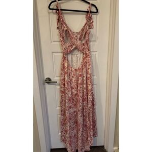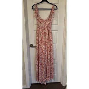 Elegant floral maxi dress in beautiful pink and cream. Functional shoulder ties, smocked bodice with crossed back detailing. Worn once.