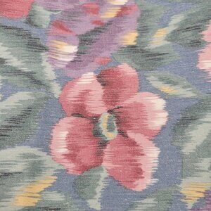 Pink floral fabric on green, blue and purple background. Medium cotton quality fabric. Has a blurred look. Unbranded.