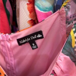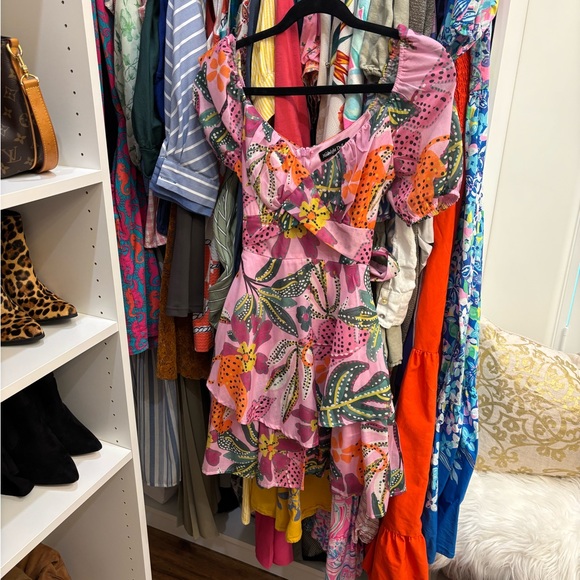Vibrant pink dress with floral patterns. Features ruffle details and short sleeves.