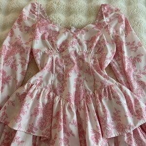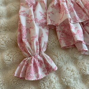 Romper with pink floral pattern and ruffle details. Perfect for a stylish look.