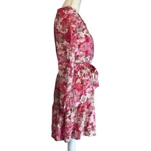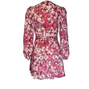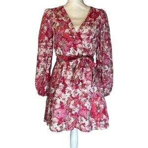 Elegant floral pink wrap dress perfect for any occasion. Features a flattering V-neckline and long sleeves. A must-have addition to your wardrobe.