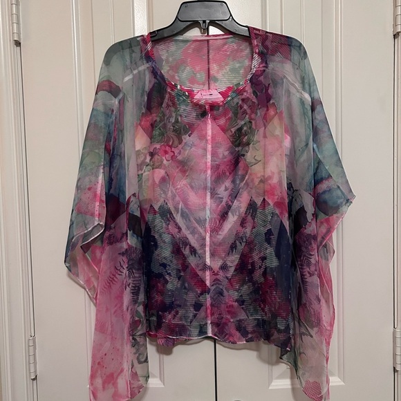 Elegant women's top featuring a beautiful floral design in pink and blue hues. Perfect for adding a touch of color to your wardrobe. This is a tank top with the cover-up. It is a two piece set. You can wear the tank top alone or if going out somewhere and you wanna jazz it up you can throw on the lightweight topper.