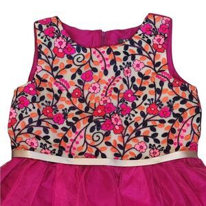 Vibrant sleeveless dress with a floral embroidered top and tulle skirt. Perfect for special occasions. Champagne ribbon accent at waist