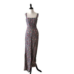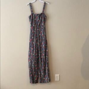 Floral plaid jumpsuit with bow tie back. Wide leg. Elastic waist back. Lined bodice. 100% polyester.