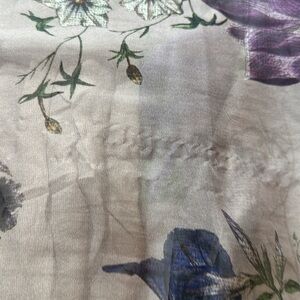 Elegant sheer maxi dress featuring a floral pattern with purple and green accents. Relaxed fit. Perfect for a stylish summer look. Features lace inserts on sleeves and bottom of the dress. Includes a stretchy slip that can be changed.