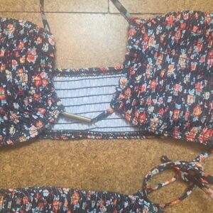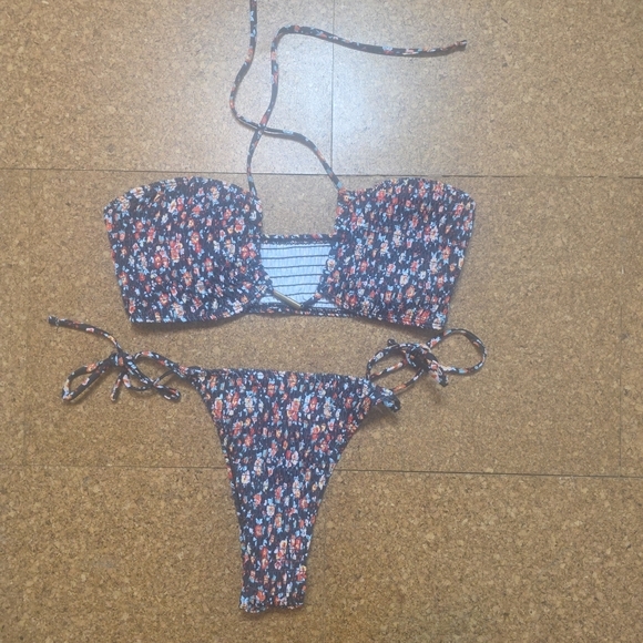 Stylish floral print bikini set perfect for summer. Features a vibrant mix of colors for a chic beach look.
