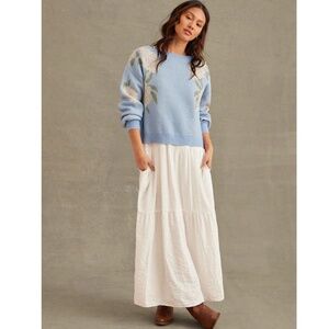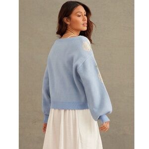 Floral Print Blue Knit Round Neck Long Sleeve Pullover Sweater