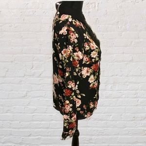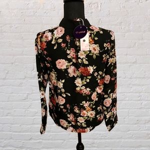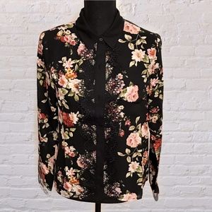 This beautiful blouse features a button down style with a floral print on a black background. The lace black lace trim adds and extra touch to the front of the blouse making it perfect to pair with slacks or a skirt for a work week look. Also would go great paired with jeans and boots both to the knee, over the knee or booties.
