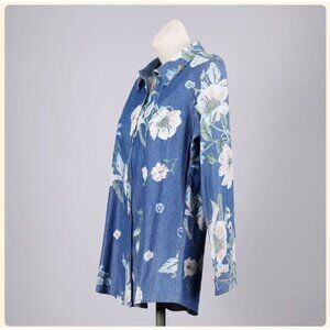Add a pop of spring to your closet with the Floral Print Denim Top! This shirt features long sleeves, a collar, and buttons down the front. The bright flowers pop on the denim material! Size large.