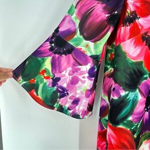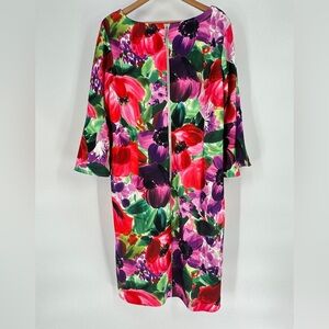 Keywords: floral dress, red purple green dress, bell sleeve dress, cocktail dress, party dress, career dress, boat neck dress, floral print, statement dress, womens dress, midi dress, special occasion dress