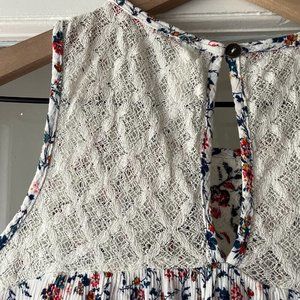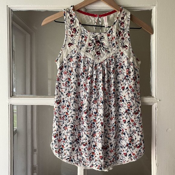 Worn once, this feminine tank needs a new home! The small floral pattern and lace details along the back and bodice complement the comfortable, crepe-like fabric. A keyhole back provides beautiful detail.