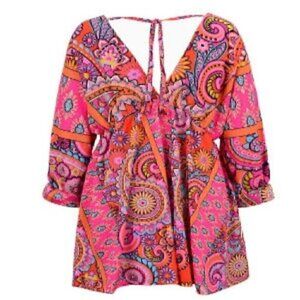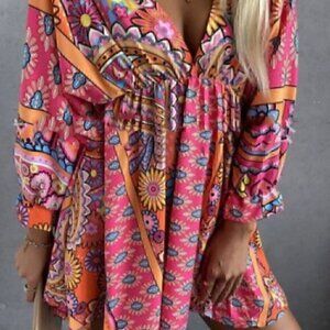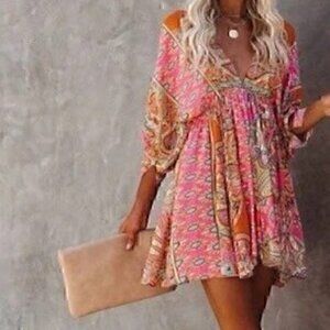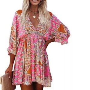 Floral Print Lace Up V-neck Dress, Boho Short Sleeve Waist Backless Summer L